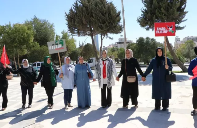 Kilis'te "Özgür Filistin" yazılı döviz taşıyan kadınlar, bir araya gelerek İsrail saldırılarını protesto etti.