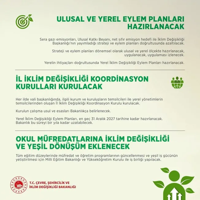 Her ilde vali başkanlığında, ilgili kurum ve kuruluşların temsilcileri ile yerel yönetimlerin temsilcilerinden oluşan İl İklim Değişikliği Koordinasyon Kurulu kurulacak. Kurulun çalışma usul ve esasları Bakanlıkça belirlenecek. Yerel İklim Değişikliği Eylem Planları, en geç 31 Aralık 2027 tarihine kadar hazırlanacak. Bakanlık bu süreyi bir yıla kadar uzatabilecek.
