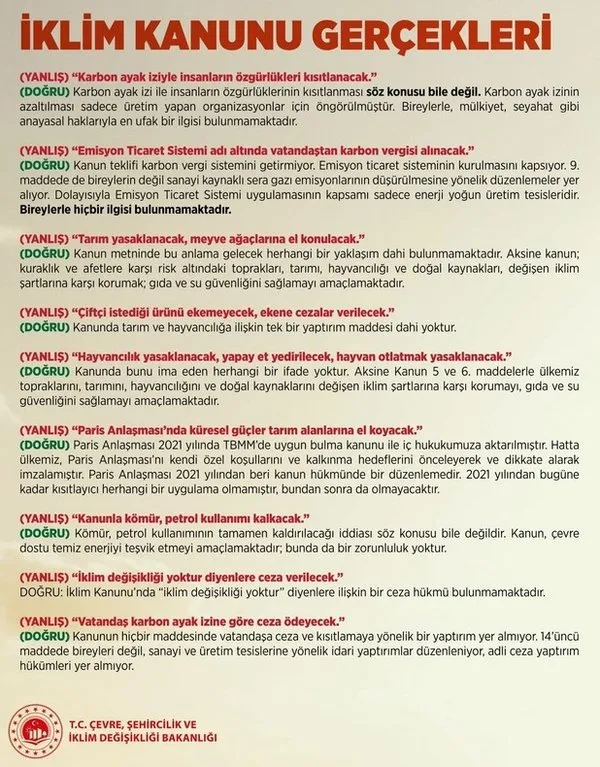 Çevre, Şehircilik ve İklim Değişikliği Bakanlığının sosyal medya hesabından, "İklim Kanunu Gerçekleri" başlığıyla bir infografik paylaşıldı. Paylaşımda, İklim Kanunu kapsamında kamuoyunda sıkça dile getirilen iddialara ilişkin açıklamalar yer aldı.