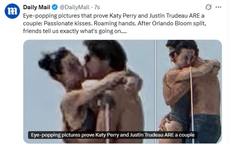 Daily Mail tarafından yayınlanan fotoğraflarda, Katy Perry ve Justin Trudeau, teknede öpüşürken ve birbirlerine sarılırken görülüyor. Fotoğraflarda ünlü şarkıcının siyah mayoyla, Trudeau'nun ise üstü çıplak, kot pantolonlu olması dikkat çekti.