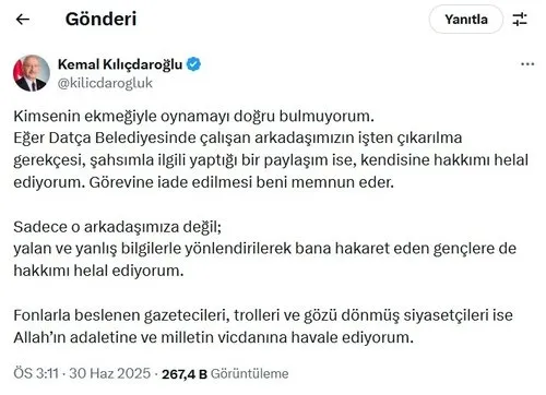 Eğer Datça Belediyesinde çalışan arkadaşımızın işten çıkarılma gerekçesi, şahsımla ilgili yaptığı bir paylaşım ise, kendisine hakkımı helal ediyorum. Görevine iade edilmesi beni memnun eder.