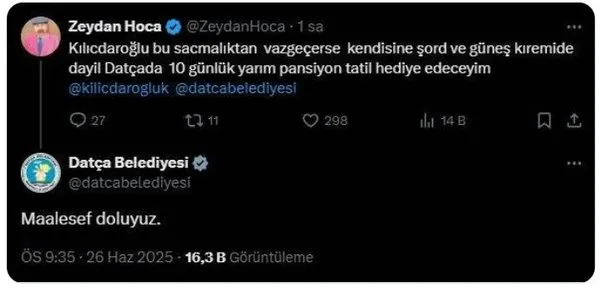 Geçtiğimiz günlerde sosyal medyada bir kullanıcı, CHP'nin şaibeli kurultay davasına ilişkin 'mutlak butlan' durumunda Kemal Kılıçdaroğlu'nun partinin başına geçeceği tartışmalarıyla ilgili paylaşım yaptı. Paylaşımda, "Kılıçdaroğlu bu saçmalıktan vazgeçerse kendisine şort ve güneş kremi de dahil Datça'da 10 günlük yarım pansiyon tatil hediye edeceğim" dedi. Datça Belediyesi ise "Maalesef doluyuz" diyerek yanıt verdi. Paylaşım sonrası Datça Belediyesi'nin sosyal medya hesabını yöneten Osman Akın'ın görevine son verildi.