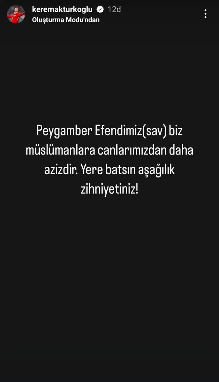 Kerem Aktürkoğlu sosyal medya hesabından yaptığı paylaşımda "Peygamber Efendimiz (S.A.V) biz Müslümanlara canlarımızdan daha azizdir. Yere batsın, aşağılık zihniyetiniz!" ifadelerini kullandı.