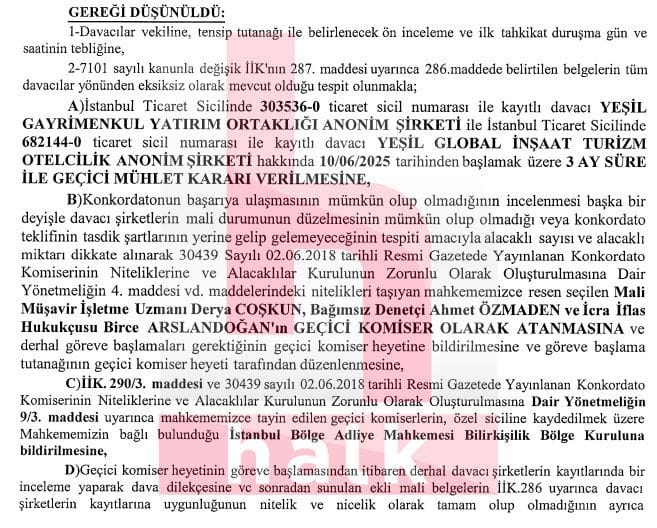 Adres değişikliği ile yeniden konkordato talebinde bulunmak için harekete geçen Yeşil GYO, yeni konkordato başvurusunu Gebze mahkemesine yaptı. Mahkeme Yeşil Gayrimenkul Yatırım Ortaklığı A.Ş. ile Yeşil Global İnşaat Turizm Otelcilik A.Ş. hakkında 10/06/2025 tarihinden başlamak üzere 3 ay süre ile geçici mühlet kararı verdi.