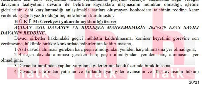 SÜRECİ YENİDEN BAŞLATTIBakırköy mahkemesinin verdiği ret kararı ile birlikte konkordato komiser heyetinin görevine de son verildi. Bu kararla birlikte, şirket, olası haciz girişimlerine karşı da savunmasız konuma düştü.