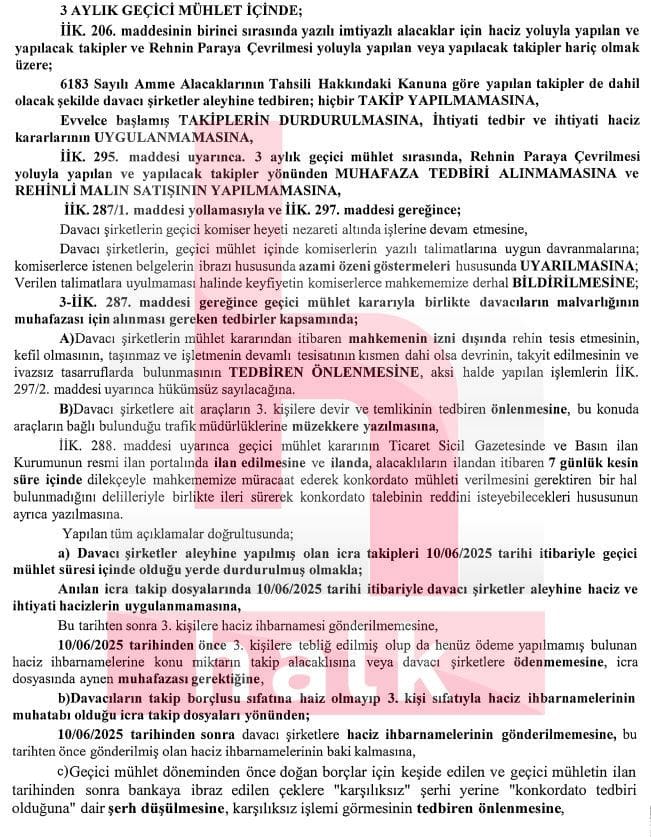 3 aylık geçici mühlet içinde; imtiyazlı alacaklar için haciz yoluyla yapılan ve yapılacak takipler ve rehnin paraya çevrilmesi yoluyla yapılan veya yapılacak takipler hariç olmak üzere; şirketler aleyhine tedbiren; hiçbir takip yapılmamasına, başlamış takiplerin durdurulmasına, ihtiyati tedbir ve ihtiyati haciz kararlarının uygulanmamasına, rehnin paraya çevrilmesi yoluyla yapılan ve yapılacak takipler yönünden muhafaza tedbiri alınmamasına ve rehinli malın satışının yapılmamasına, önceden doğan borçlar için bankaya ibraz edilen çeklere "karşılıksız" şerhi yerine "konkordato tedbiri olduğuna" dair şerh düşülmesine, karşılıksız işlemi görmesinin tedbiren önlenmesine karar verildi.