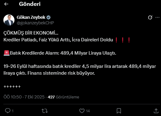 CHP’li Gökhan Zeybek, sosyal medya hesabından yaptığı paylaşımda Türkiye ekonomisinin içinde bulunduğu darboğaza dikkat çekti. Zeybek, 19–26 Eylül haftasında batık kredilerin 4,5 milyar lira artarak 489,4 milyar liraya çıktığını belirterek, finans sisteminde riskin tehlikeli biçimde büyüdüğünü vurguladı.