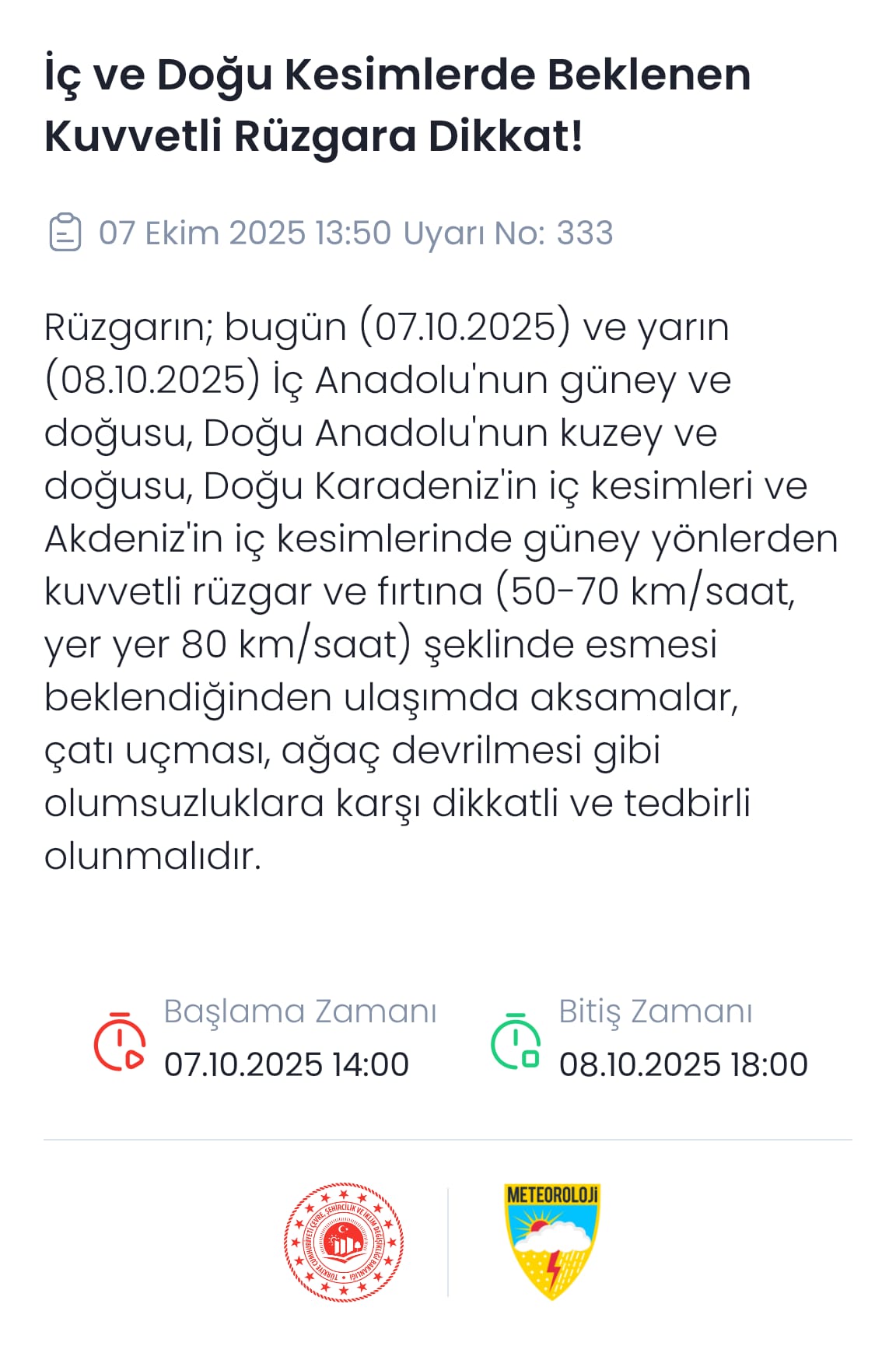 Söz konusu uyarıda, "Rüzgarın; bugün (07.10.2025) ve yarın (08.10.2025) İç Anadolu'nun güney ve doğusu, Doğu Anadolu'nun kuzey ve doğusu, Doğu Karadeniz'in iç kesimleri ve Akdeniz'in iç kesimlerinde güney yönlerden kuvvetli rüzgar ve fırtına (50-70 km/saat, yer yer 80 km/saat) şeklinde esmesi beklendiğinden ulaşımda aksamalar, çatı uçması, ağaç devrilmesi gibi olumsuzluklara karşı dikkatli ve tedbirli olunmalıdır" ifadelerine yer verildi.