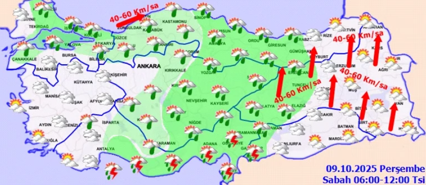 Meteoroloji Genel Müdürlüğü (MGM), sağanak yağışlar nedeniyle Adana, Artvin, Giresun, Hatay, Kahramanmaraş, Rize, Trabzon ve Osmaniye için "sarı" kodlu meteorolojik uyarı yayımladı. Yurt genelinde parçalı ve çok bulutlu bir hava öngörülürken, Marmara’nın kuzey ve doğusu, Akdeniz, İç Anadolu, Karadeniz, Doğu Anadolu’nun kuzey ve batısı, Güneydoğu Anadolu’nun batısı ile Çanakkale, Kütahya, Bitlis ve Van çevrelerinde sağanak ve yer yer gök gürültülü sağanak yağış bekleniyor.