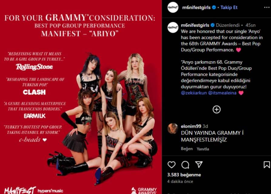 Son dönemin dikkat çeken gruplarından Manifest, uluslararası arenada önemli bir başarıya imza attı. Grubun en sevilen şarkılarından “Arıyo”, 68. Grammy Ödülleri’nde Best Pop Duo/Group Performance kategorisinde değerlendirmeye alındı.