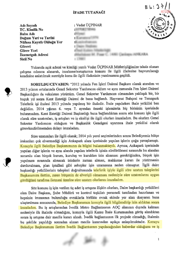 Dosyada ifadesine yer verilen eski Genel Sekreter Yardımcısı Vedat Üçpınar, tüm işlemlerin dönemin Belediye Başkanı Melih Gökçek’in bilgisi dahilinde yapıldığını belirterek şunları söyledi: