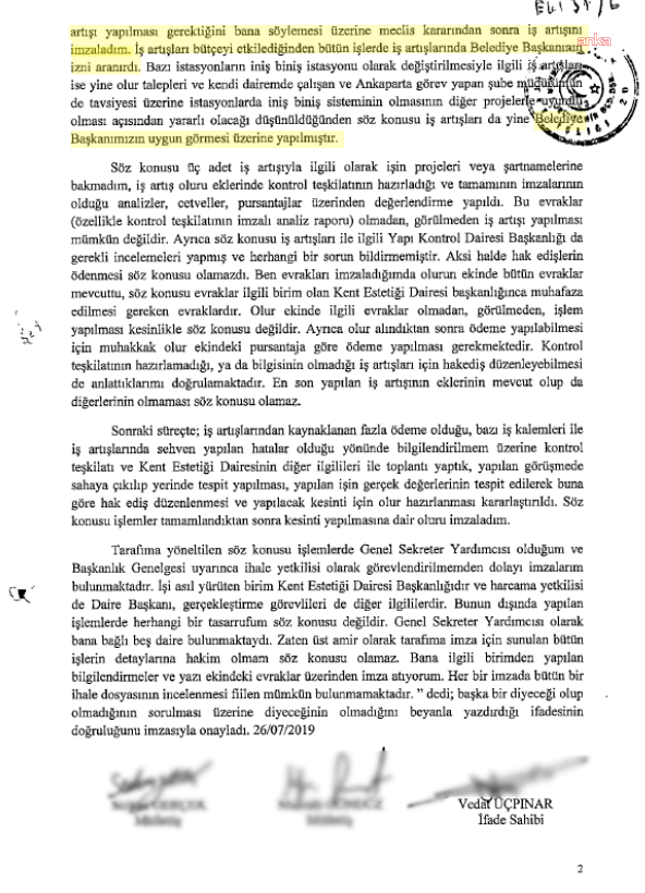 “Konuyu Belediye Başkanımıza ilettim. İvedik bağlantısının yapılması gerektiğini söyledi. Bu nedenle meclis kararının ardından iş artışını onayladım. Bütçeyi etkileyen tüm iş artışlarında Başkanın izni aranırdı.”