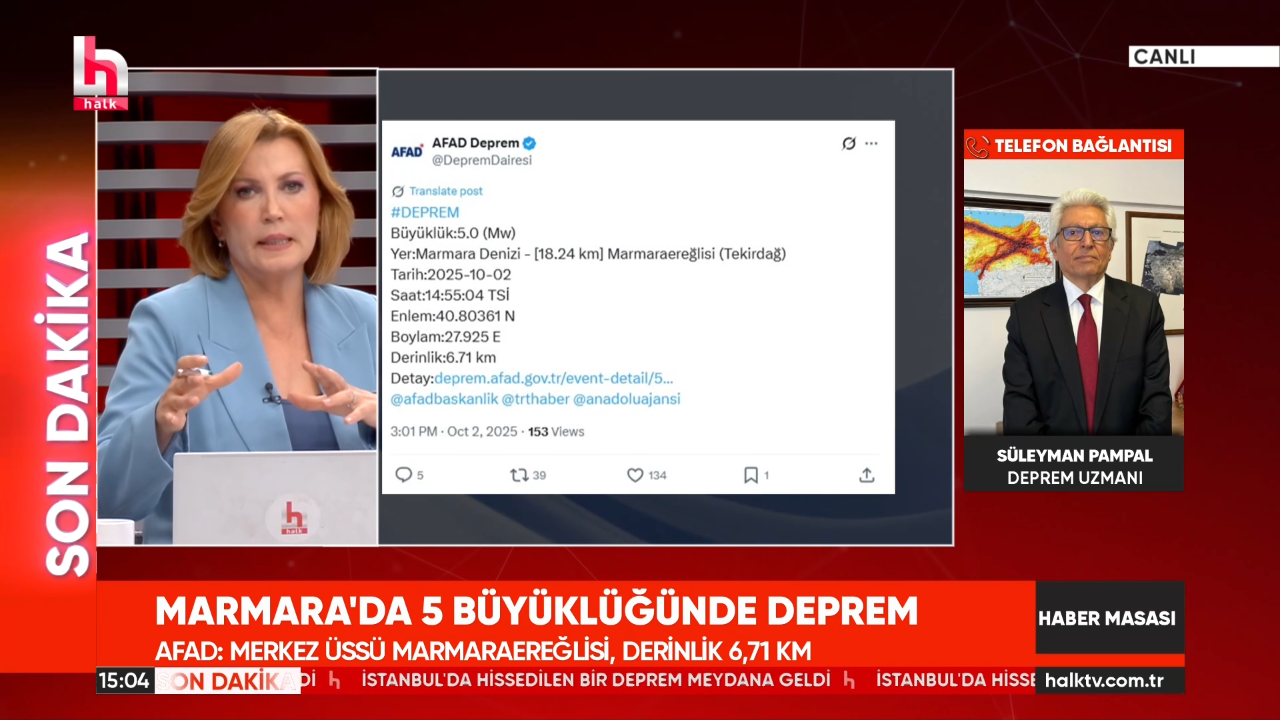 DEPREM UZMANINDAN KRİTİK AÇIKLAMAHalk TV'de Remziye Demirkol'un sunduğu Haber Masası'na konuk olan Pampal, bölgede yıkıcı bir deprem olma ihtimalinin yüksek olmadığından bahsederek şunları söyledi: