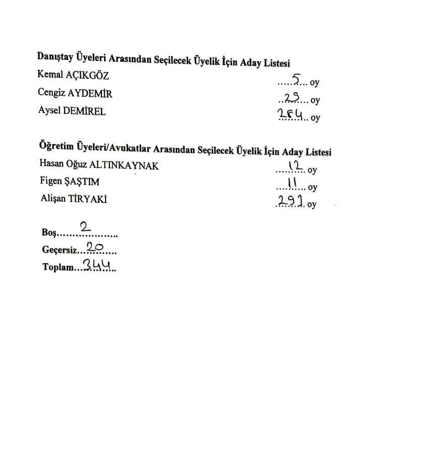 Yargıtay üyeleri arasından HSK'ya seçilen isimler; Fuzuli Aydoğdu, Hakan Yüksel ve Seyfi Han oldu. Danıştay üyeleri arasından ise Cengiz Aydemir seçildi. Öğretim üyeleri ve avukatlar listesi arasından ise Alişan Tiryaki en çok oyu alan isim oldu