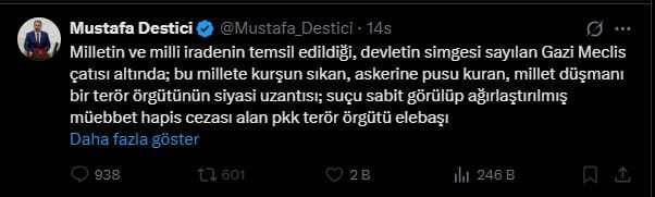 Son genel seçim ve Cumhurbaşkanlığı seçimlerinde Cumhur'un küçük ortağı olan BBP Genel Başkanı Mustafa Destici, "Bu devlete meydan okumadır. Bir kez daha söylüyoruz ki, terörle teröristle müzakere olmaz. Olursa işte böyle hadsizleşirler" dedi.