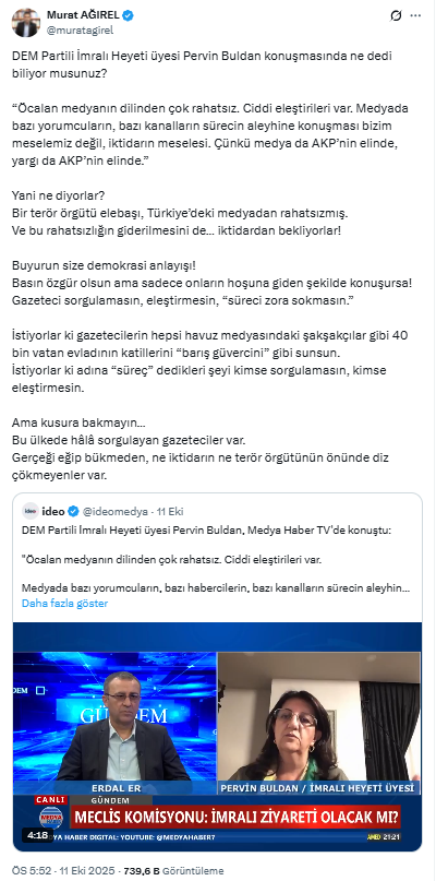 Gazeteci Murat Ağırel: "Buyurun size demokrasi anlayışı! Basın özgür olsun ama sadece onların hoşuna giden şekilde konuşursa! Gazeteci sorgulamasın, eleştirmesin, “süreci zora sokmasın.” İstiyorlar ki gazetecilerin hepsi havuz medyasındaki şakşakçılar gibi 40 bin vatan evladının katillerini “barış güvercini” gibi sunsun. İstiyorlar ki adına “süreç” dedikleri şeyi kimse sorgulamasın, kimse eleştirmesin. Ama kusura bakmayın... Bu ülkede hâlâ sorgulayan gazeteciler var. Gerçeği eğip bükmeden, ne iktidarın ne terör örgütünün önünde diz çökmeyenler var"