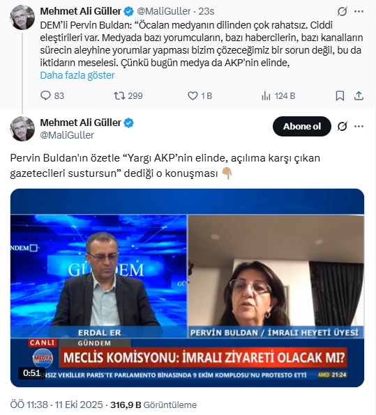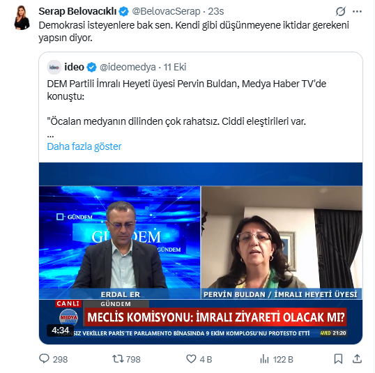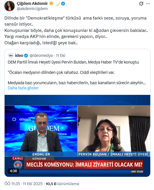 DEM Partili Buldan, Medya Haber TV'de yaptığı değerlendirmede teröristbaşı Öcalan ile DEM Parti İmralı Heyeti'nin 3 Ekim tarihinde gerçekleştirdiği son görüşmeye değinirken; Öcalan'ın, medya diline dair ciddi eleştirileri olduğunu belirtti.