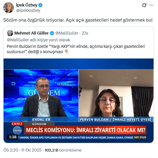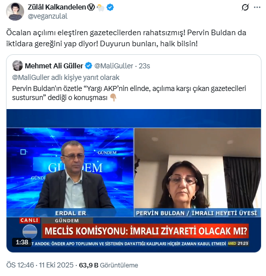 Gazeteci Zülal Kalkandelen: "Öcalan açılımı eleştiren gazetecilerden rahatsızmış! Pervin Buldan da iktidara gereğini yap diyor! Duyurun bunları, halk bilsin!"