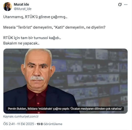 Gazeteci Murat İde: "Utanmamış, RTÜK'ü göreve çağırmış.. Mesela "Terörist" demeyelim, "Katil" demeyelim, ne diyelim? RTÜK için tam bir turnusol kağıdı.. Bakalım ne yapacak.."