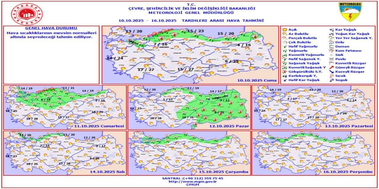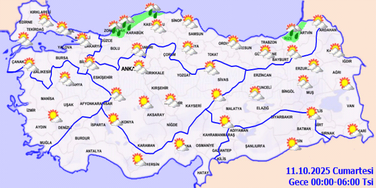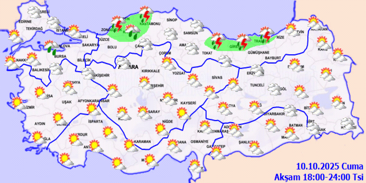 Ülkemiz genelinin parçalı yer yer çok bulutlu, Batı Karadeniz(Bolu hariç), Orta ve Doğu kıyıları ile Sakarya'nın kıyı kesimleri, Artvin ve Ardahan çevrelerinin sağanak ve yer yer gök gürültülü sağanak yağışlı geçeceği tahmin ediliyor.