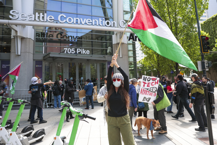 Microsoft'un mevcut ve eski çalışanları, aktivistler ve bölge halkından oluşan kalabalık, İsrail ordusuna sağladığı hizmetlere ve teknolojik altyapıya tepki göstermek için şirketin genel merkezinde toplandı.