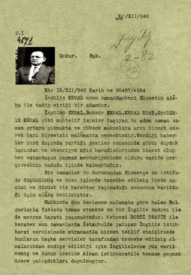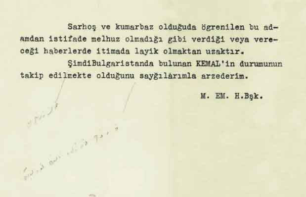 "Sarhoş ve kumarbaz olduğu da öğrenilen bu adamdan istifade melhuz olmadığı gibi verdiği veya vereceği haberlerde itimada layık olmaktan uzaktır. Şimdi Bulgaristan'da bulun Kemal'in durumunun takip edilmekte olduğunu saygılarımla arz ederim."