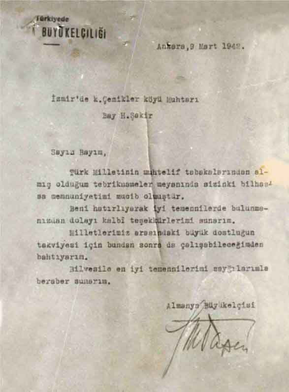 Dönemin Almanya'nın Ankara Büyükelçisi Von Papen, 1942 yılında kendisine mektup gönderen İzmir'in Karşıyaka ilçesi Şemikler Köyü Muhtarı Şakir'e cevap mektubu ve MAH İzmir Merkez Amirliği'nden konuya ilişkin 21.04.1942 tarihli raporu da koleksiyonda paylaşıldı.