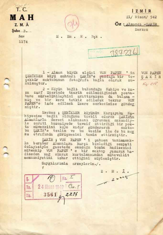 Dönemin haberlerinde de yer aldığı üzere suikasta uğrayıp kurtulan Von Papen'e tebrik mesajı gönderen Şemikler Köyü Muhtarı Şakir'in mektubu üzerine Von Papen'in cevap mektubu, zarf üzerinde açık adrese yer verilmemesi üzerine MAH'a gönderilip görevlendirilen bir postacı ile Muhtar Şakir'e ulaştırılması sağlandığı raporda yer almış.