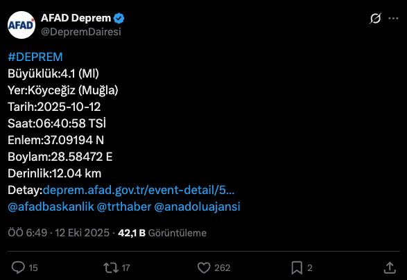 MUĞLA’DA 4,1 BÜYÜKLÜĞÜNDE DEPREMAFAD'tan gelen açıklamaya göre sabah 6.40 sularında meydana gelen depremin merkez üssü Köyceğiz ilçesi olduğu kaydedildi. Depremin büyüklüğünün 4.1 olarak kaydedildiği sarsıntının 12,04 kilometre derinlikte meydana geldiği belirlendi.