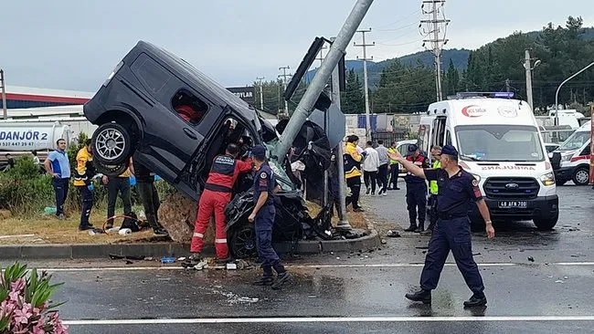 Çarpmanın etkisi ile araç adeta ikiye bölünüp direkte asılı halde kaldı. Kazada yaralanan A.T., H.A. ve A.G. ambulanslarla hastaneye kaldırıldı.