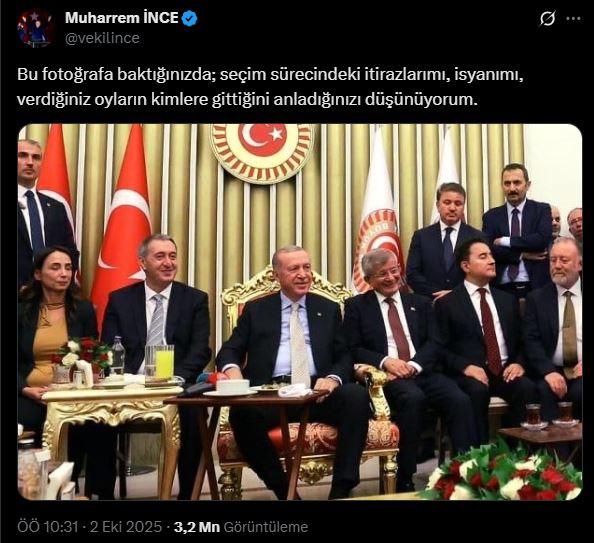 Muhalefet partisi liderleriyle sohbet gerçekleştiren Erdoğan’a resepsiyonda ilgi yoğunken CHP’den ayrılarak Memleket Partisini kuran ve daha sonra yeniden CHP’ye geçen Muharrem İnce sosyal medya hesabından paylaşım yaparak, “Bu fotoğrafa baktığınızda; seçim sürecindeki itirazlarımı, isyanımı, verdiğiniz oyların kimlere gittiğini anladığınızı düşünüyorum” demişti.