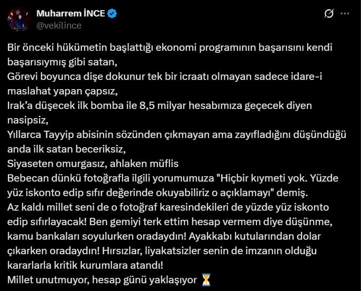 Babacan'ın "sıfır değerinde" sözlerine Muharrem İnce'nin yanıtı ise çok daha sert oldu. Sosyal medya hesabından, "Bebecan" hitabıyla başladığı bir açıklama yayımlayan İnce, Babacan'ı hedef alan ağır ifadeler kullandı. İnce, açıklamasında şu suçlamalarda bulundu: