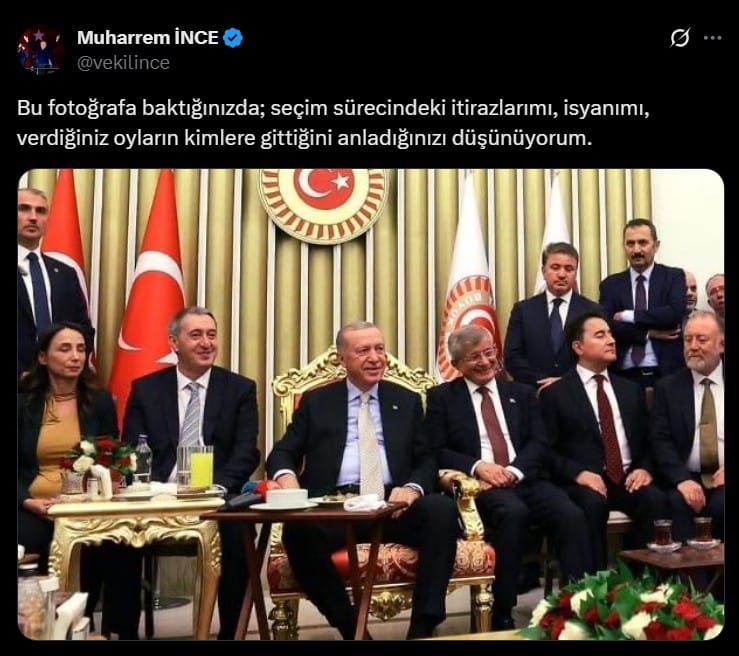 Kamuoyunda geniş yankı uyandıran bu fotoğraf karesine ilk tepkilerden biri, CHP'li Muharrem İnce'den geldi. İnce, fotoğrafı sosyal medya hesabından paylaşarak, seçim sürecindeki tutumuna atıfta bulundu ve "Bu fotoğrafa baktığınızda; seçim sürecindeki itirazlarımı, isyanımı, verdiğiniz oyların kimlere gittiğini anladığınızı düşünüyorum" ifadelerini kullandı.