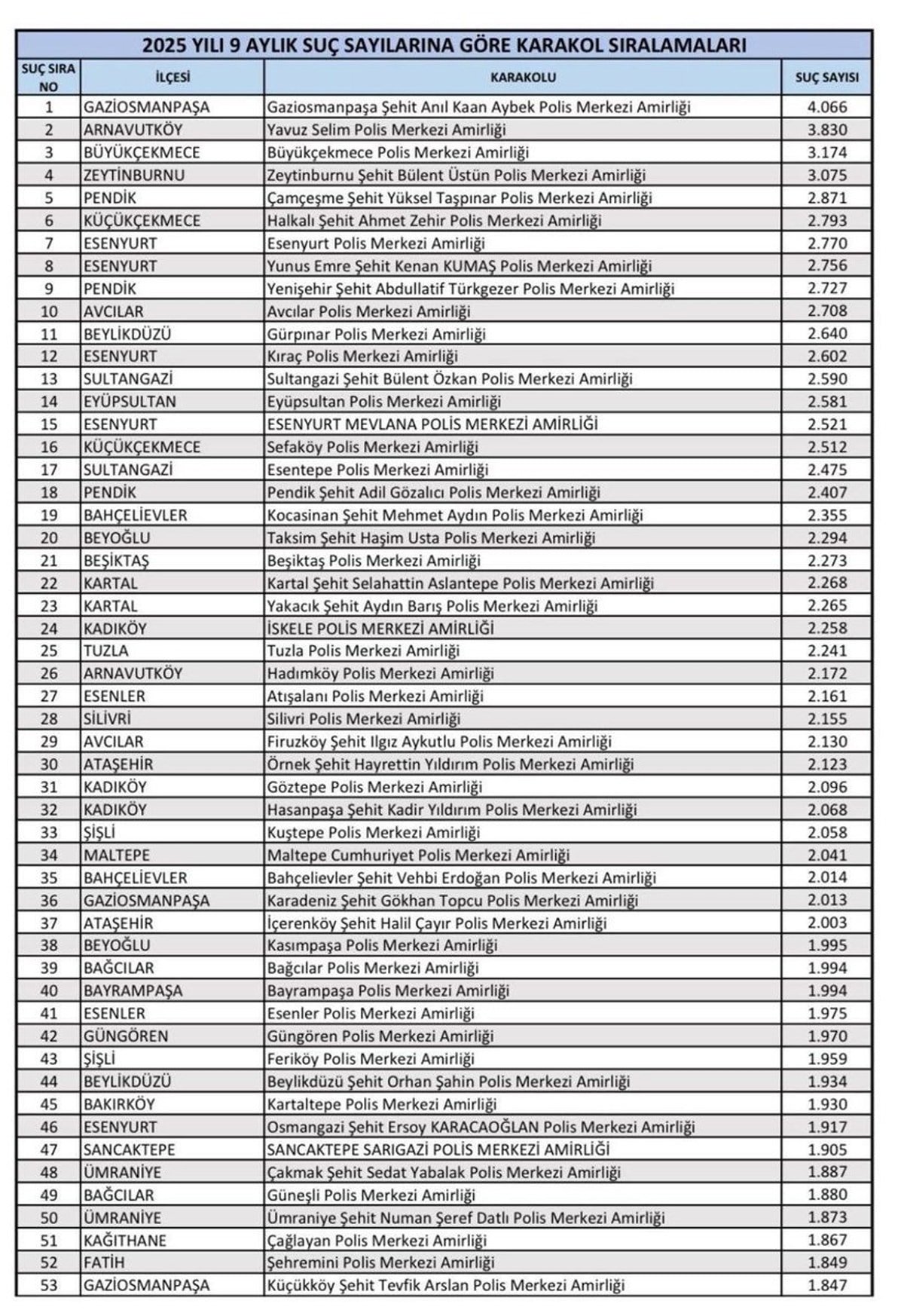 ARNAVUTKÖY VE BÜYÜKÇEKMECE İLK ÜÇTEİstanbul Emniyet Müdürlüğü’nün 2025 yılı ilk dokuz aylık verilerine göre, kentte en fazla suç olayının yaşandığı ilçe Gaziosmanpaşa oldu. Gaziosmanpaşa’yı, yaklaşık 3 bin 800 suç olayıyla Arnavutköy, onu da 3 bin 100 vakayla Büyükçekmece izledi.