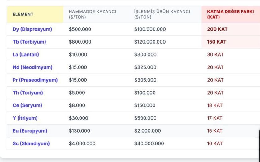 Beylikova’daki cevher ortalama %1 oranında nadir element içeriyor. Yani 1 ton taşın içinden 10 kilogram saf element çıkıyor. Bu miktar ham halde satılırsa Türkiye’nin kazancı 10 ila 20 bin dolar arasında kalıyor. Ama aynı miktar ABD’de veya Çin’de işlenip mıknatıs, pil, lazer ya da sensore dönüştürüldüğünde, elde edilen gelir 200 ila 500 bin dolar seviyesine ulaşıyor. Bu durumda her ton taş için Türkiye yaklaşık 335 bin dolar katma değer kaybediyor. Bu fark, yüz milyonlarca tonluk rezerv düşünüldüğünde trilyonlarca dolarlık bir kayba karşılık geliyor.
