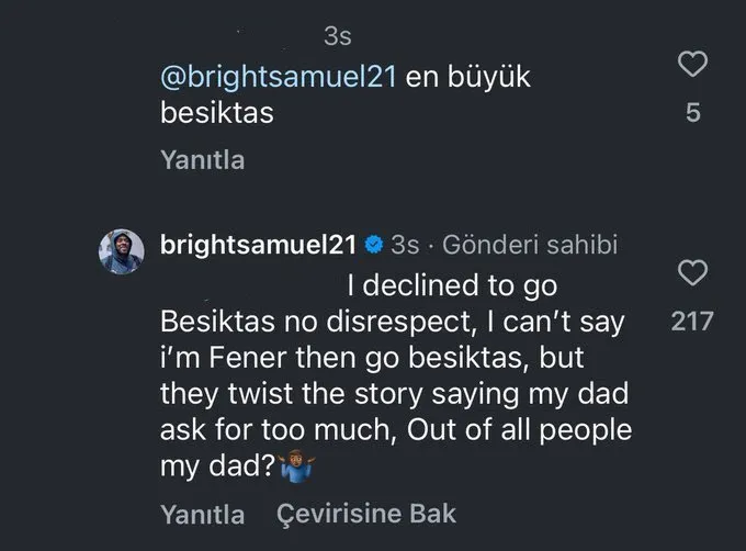 Sosyal medya hesabından bir takipçisine cevap veren Osayi, şu ifadeleri kullandı: "En büyük Fener! Beşiktaş'a gitmeyi reddettim. Onlara saygısızlık etmek istemem ama ''Fenerbahçeliyim'' deyip, oraya gidemem!