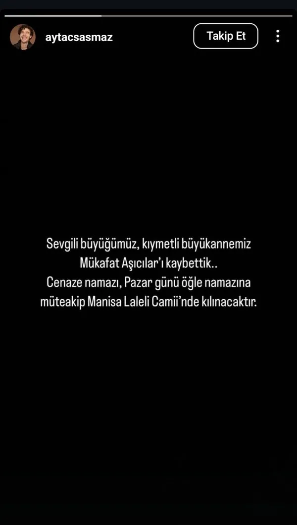 Sosyal medya hesabında yaptığı paylaşımla büyükannesi Mükafat Aşıcılar'ın hayatını kaybettiğini duyurdu.