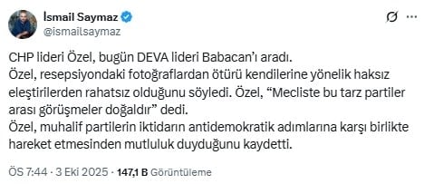 "CHP lideri Özel, bugün DEVA lideri Babacan’ı aradı. Özel, resepsiyondaki fotoğraflardan ötürü kendilerine yönelik haksız eleştirilerden rahatsız olduğunu söyledi. Özel, “Mecliste bu tarz partiler arası görüşmeler doğaldır” dedi. Özel, muhalif partilerin iktidarın antidemokratik adımlarına karşı birlikte hareket etmesinden mutluluk duyduğunu kaydetti."