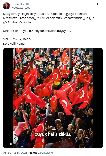 Özel, yurttaşı, Bolu mitingine şu ifadelerle davet etti: