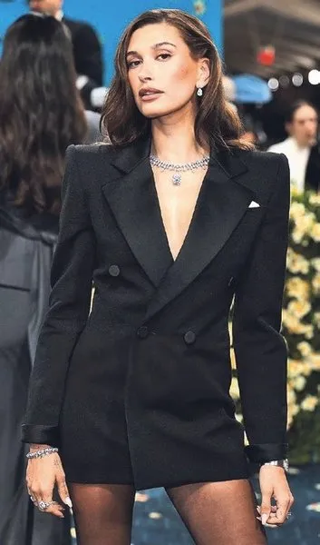 Hailey Bieber sadece "görünmek" için gelmiş gibiydi. Zira Saint Laurent blazer'ının tema ile alakası yoktu. Yalnızca temiz bir görünüm sunmuştu o kadar.