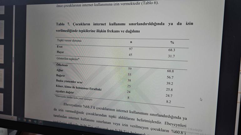 “Bu da bir bağımlılık aslında; çocuk öfkelenerek, bağırıp çağırarak, ağlayarak tepki gösteriyordu ve ebeveyn çocuk ilişkisi daha çok gerginleşiyordu. Zaten biz ebeveyn çocuk ilişkisiyle de çocuğun problemli internet kullanımı arasında bir ilişki bulmuştuk. Yani ebeveyn çocuk ilişkisinde çatışma boyutu daha çok görünüyordu. İnterneti daha çok kullanan çocuklar 4-6 yaş grubu olmalarına rağmen ebeveynleriyle bu konuda daha çok çatışma yaşıyorlardı. Şöyle bir bulgumuz vardı; ebeveynler genellikle bir ödül karşılığı internet kullanımına izin veriyorlardı, bu da en çok yemek yedikten sonraydı. İnterneti bir yemek yedirme aracı gibi görüyorlardı. Bunun dışında çocuk ona bağırıyor, ebeveyn ona kızıyor gibi sorunlarımız vardı. Karşılıklı, birbirleriyle daha olumsuz iletişim şekli, bağırma, belki çocuk küsüp odasına gidiyor anne bir sonraki yapacağı şeye de izin vermiyor. Olumsuz durum bir kısır döngü şeklinde devam ediyor.”