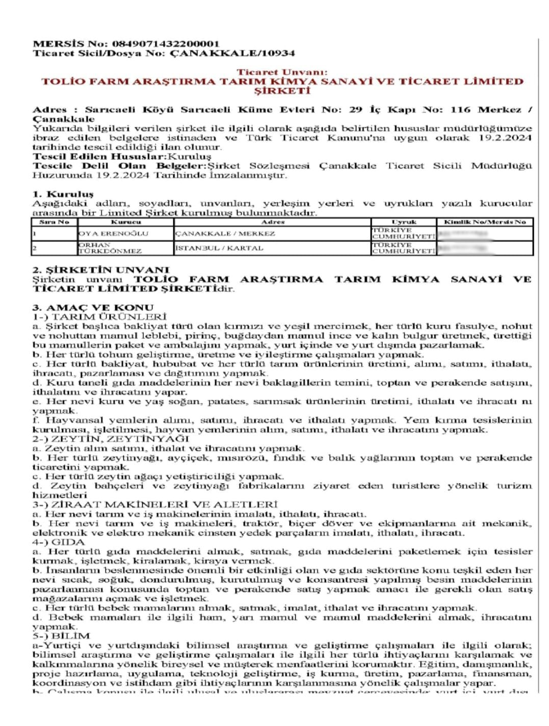 Bunun için gerekli olan zeytinyağı alımına ihtiyaç vardı. Üniversite Rektörü Cüneyt Erenoğlu, 2024 yılında kurulmuş Tolio Farm adlı şirketten zeytinyağları aldı. Buraya kadar her şey normal görünüyor fakat şirketin Ticaret Sicil Gazetesi’ndeki bilgilerine bakınca çarpıcı gerçek ortaya çıkıyor.