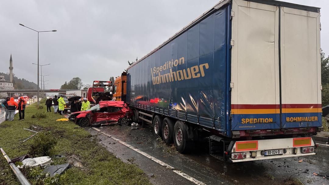Otomobil, Rize yönüne giden D.M. idaresindeki HR-822-HH plakalı tıra çarptı. İhbar üzerine bölgeye 112 Acil Servis ve polis ekipleri sevk edildi. Kazada, otomobil sürücüsü ile otomobilde bulunan Gülsüm Okumuş'un olay yerinde öldüğü belirlendi.