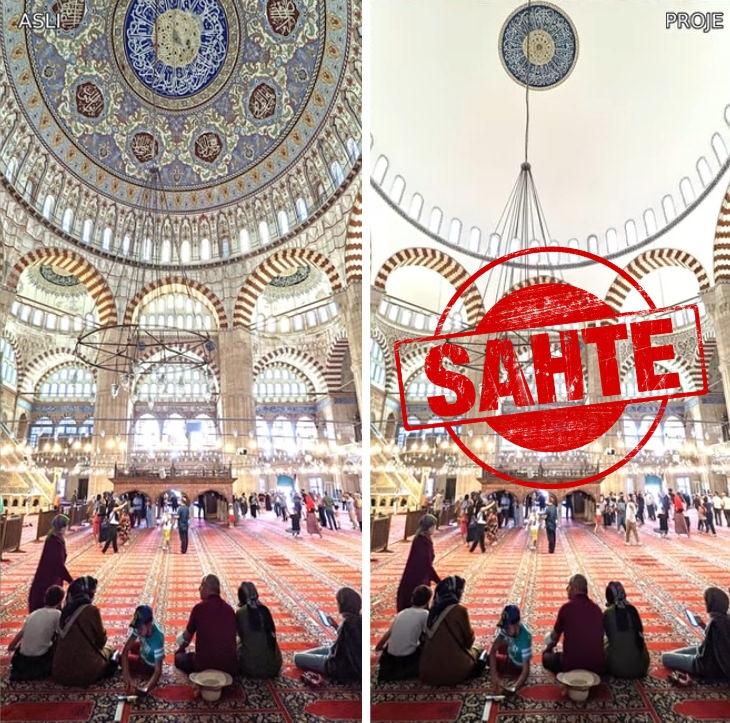 -Yarım kubbelerdeki özgün Mimar Sinan dönemi tezyinatı ile aralarındaki mukarnaslara müdahale edilmemesine rağmen, sahte görselde tamamen yok edilmiş gibi gösterildi.