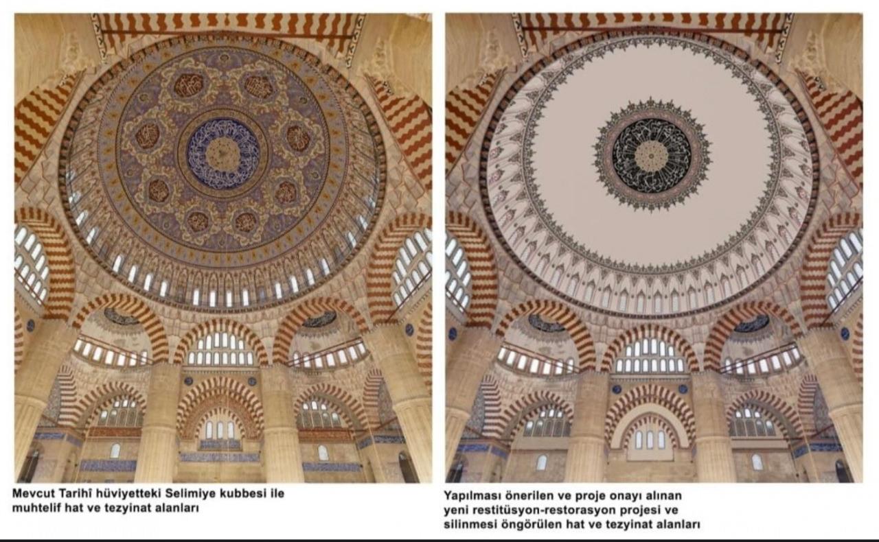 Mimar Sinan’ın ustalık eseri Selimiye Camii’ndeki restorasyon, kubbe tezyinatındaki tahrifi gün yüzüne çıkardı. Yetkililer, 16. yüzyıl özgünlüğüne dönmek için 19. yüzyıl ve sonrasındaki eklentileri temizlediklerini açıkladı.