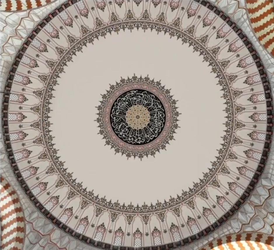 -“Uydurulduğu” söylenen fakat aslında yarım kubbelerden alınarak ana kubbeye taşınan zarif rumi tığ desenleri kazınmış gibi yansıtıldı.