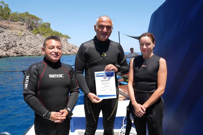 Kültür ve Turizm Bakanı Sayın Mehmet Nuri Ersoy, Uluslararası Dalış Eğitmenleri Profesyonel Birliği Türkiye İdari Temsilcisi Asutay Akbayır ile 2021 yılında başladığı dalış eğitimlerini ileri seviyeye taşıyarak, Adrasan'da gerçekleştirdiği bu özel dalışta Derin Dalış Uzmanlık Sertifikası almaya da hak kazandı.