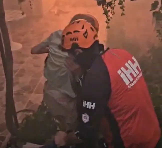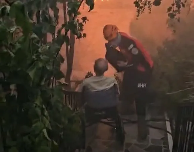 İzmir'in Menderes ilçesinde başlayan ve Seferihisar'da çok sayıda evi küle çeviren orman yangınında duygu dolu kareler ortaya çıktı. Evinden çıkamayan tekerlekli sandalyedeki yaşlı adam ve yine evlerinde mahsur kalan bir vatandaş ile kedisi ekipler tarafından kurtarıldı. Yangını kontrol altına alma çalışmaları sürüyor.