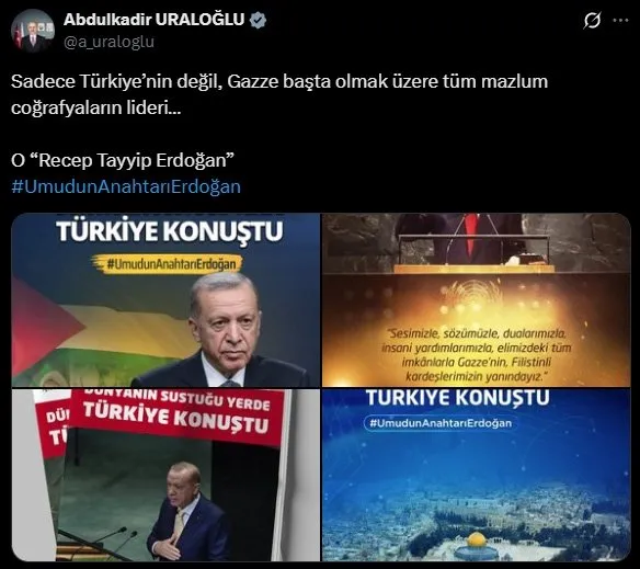 Ulaştırma ve Altyapı Bakanı Abdulkadir Uraloğlu: Sadece Türkiye'nin değil, Gazze başta olmak üzere tüm mazlum coğrafyaların lideri… O "Recep Tayyip Erdoğan"