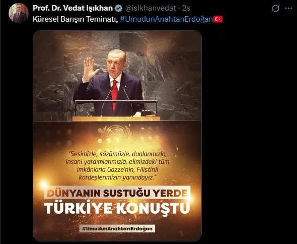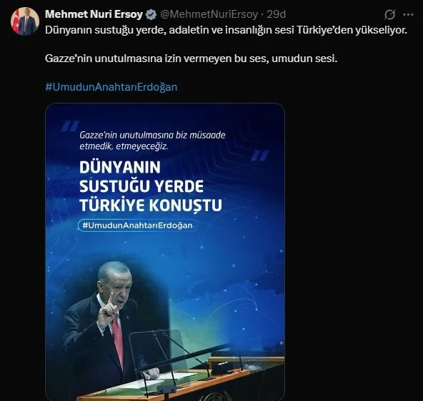 Birleşmiş Milletler 80. Genel Kurulu'nda yaptığı konuşmada bir kez daha mazlumların sesi olan, Gazze'deki Filistinlilerin uğradığı soykırımı dünyaya haykıran Başkan Erdoğan'ın bu çabaları sosyal medyada da gündem oldu.
